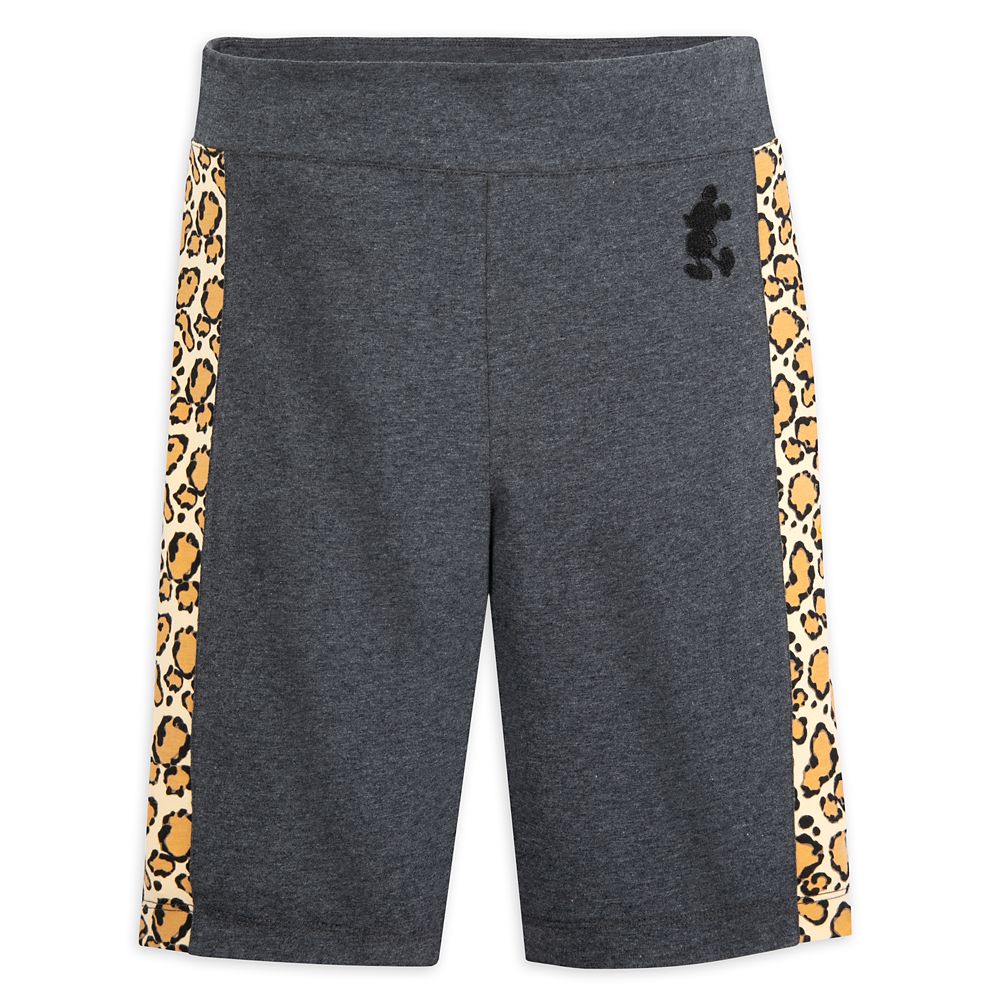 Take a ride on the wild side in these animal print bike shorts. Accented with an embroidered Mickey Mouse silhouette on the front, these soft, stretchy shorts are fiercely stylish.