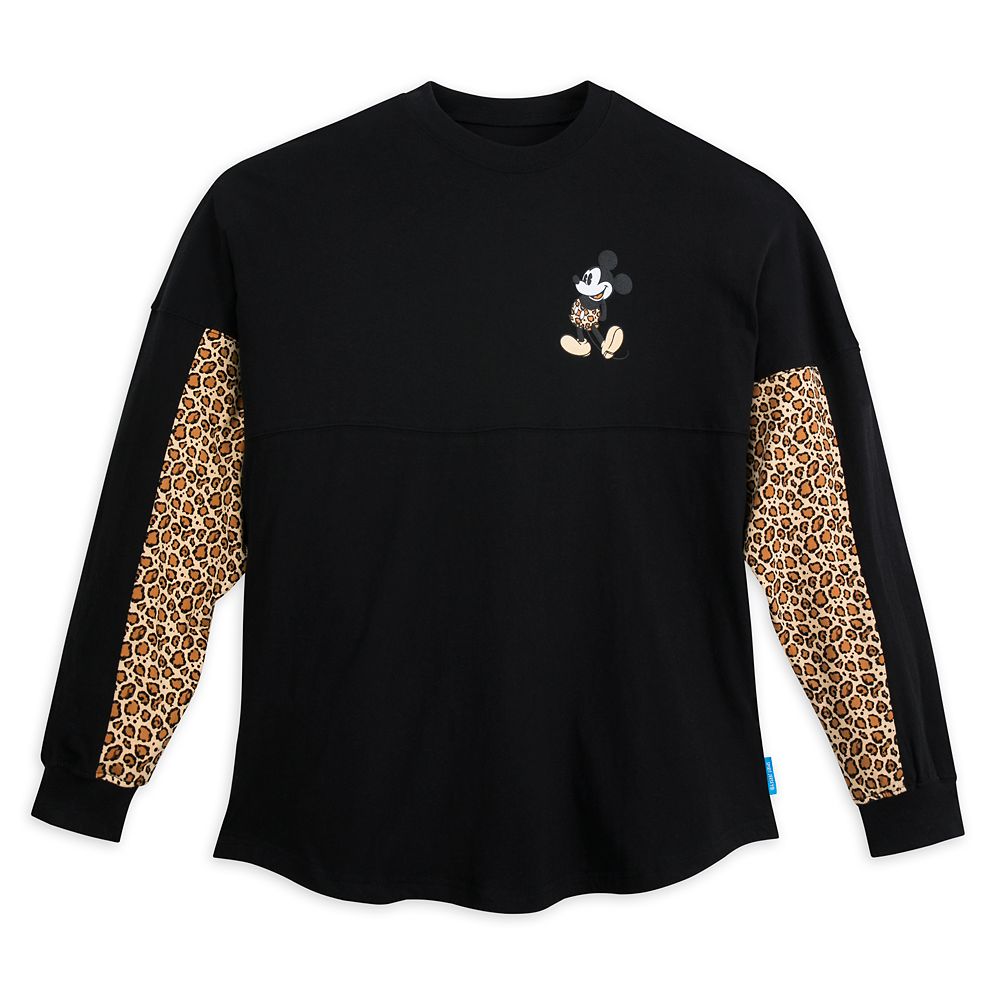 Look wildly stylish and keep comfy in this Spirit Jersey with puffy Walt Disney World logo on the back. Direct from The Most Magical Place on Earth, this pullover features animal print on the lower half of the sleeves and Mickey looking fierce in his own animal print shorts on the chest.
