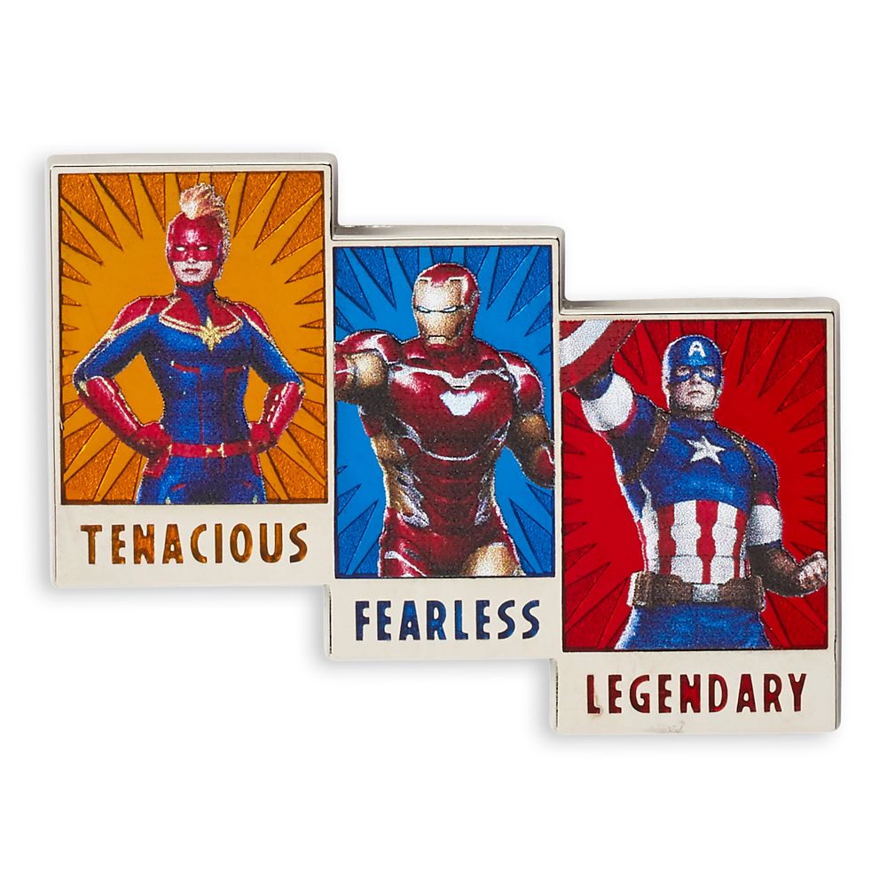 A trio of Marvel super heroes team up on this enamel cloisonné pin. The ”Tenacious” Captain Marvel, the ”Fearless” Iron Man, and the ”Legendary” Captain America are featured above a phrase they’re commonly associated with.