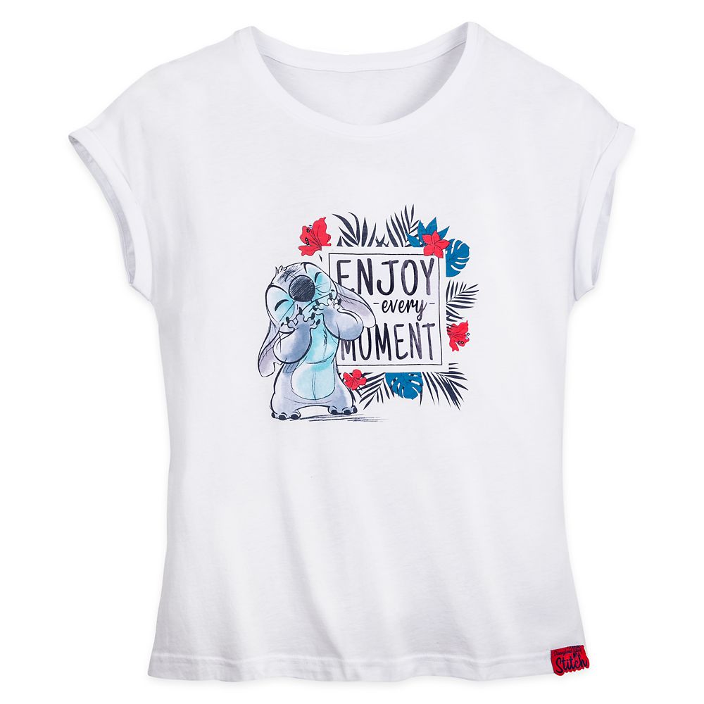 Enjoy every moment with Stitch in this tres chic fitted fashion tee from Disneyland Paris featuring rolled-cuff dolman sleeves and tropical floral filigree.