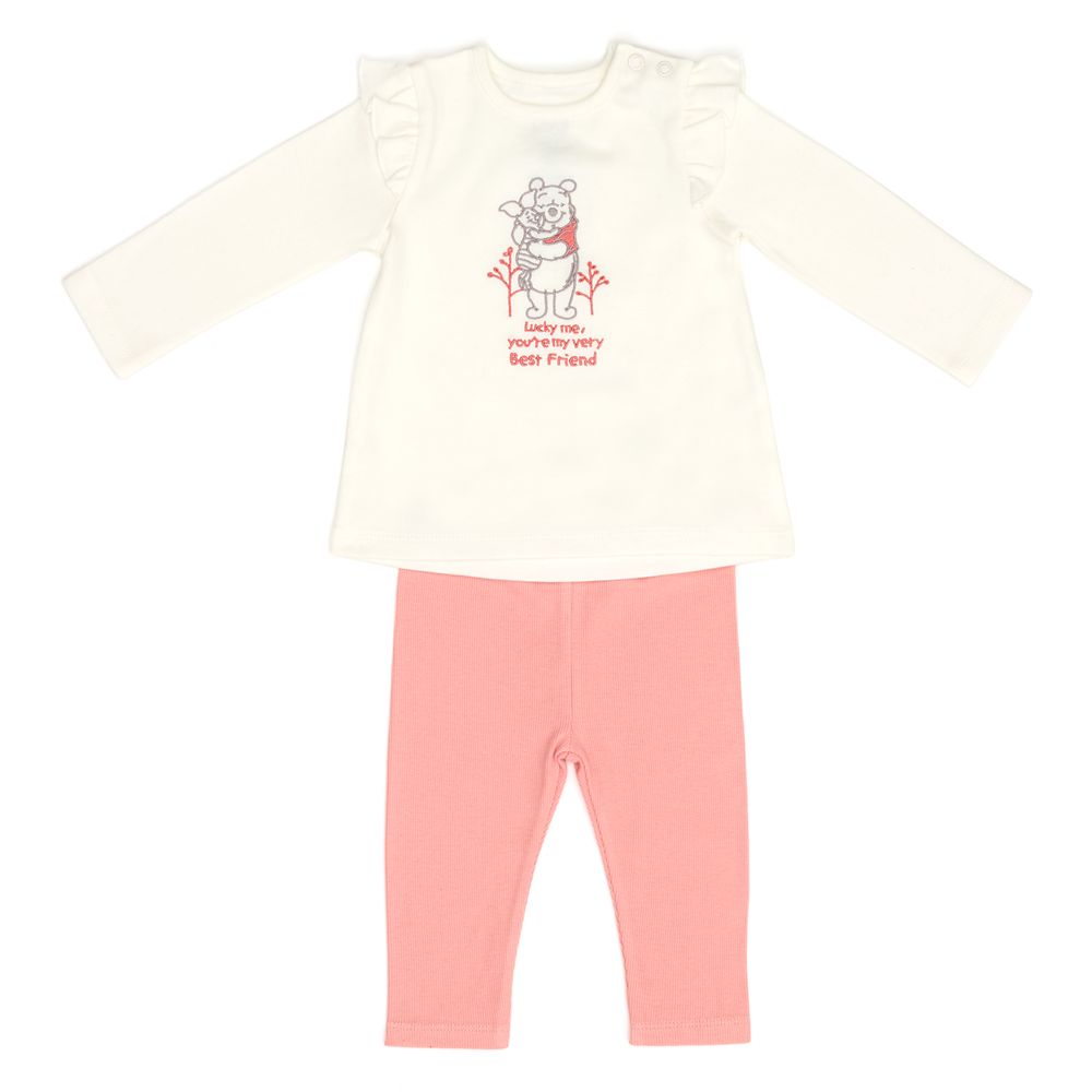Your little one will look ever so cute in this honey of an outfit that features besties Pooh and Piglet. The two-piece set features a long sleeve top with ruffled shoulders and an embroidered design on the front, while the pink ribbed leggings complete the look.