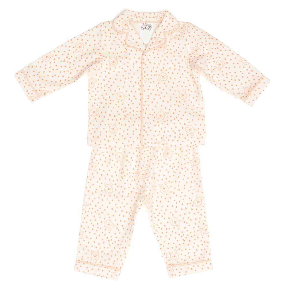 Baby will enjoy a Hundred Acres of sweet dreams when tucked into bed wearing this cozy two-piece pajama set. The coordinating button-front top and elastic waist pants feature an allover pattern of Winnie the Pooh faces.