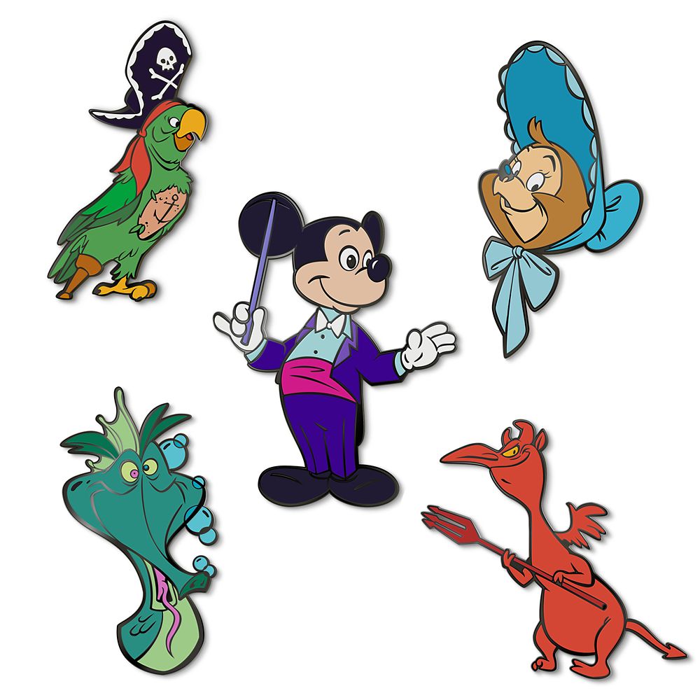 • Set of five pins includes: Peg Leg Parrot from Pirates of the Caribbean, Bubbles from The Country Bear Jamboree, Sea Serpent from 20,000 Leagues Under the Sea, Red Demon from Mr. Toad’s Wild Ride, and Maestro Mickey from The Mickey Mouse Revue