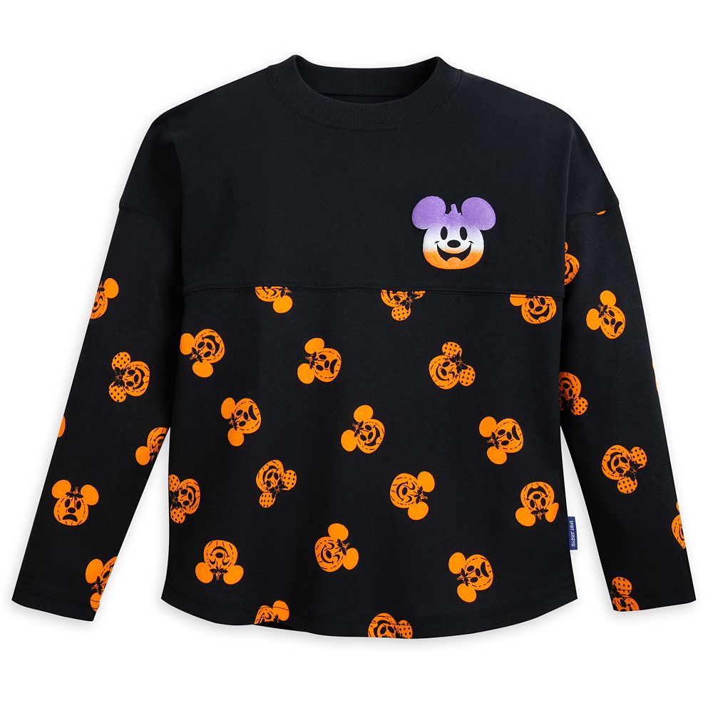 Summon the spirits of the spooky season in this premium pullover Spirit Jersey with pieced yoke, plus puffy ”Happy Halloween” banner in candy corn colors–and an allover Mickey and Minnie Mouse Pumpkin print.