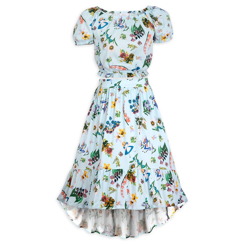 Celebrate the 70th Anniversary of Walt Disney’s Alice in Wonderland and the whimsical world of Disney Legend Mary Blair in this delightful two-piece dress set by Her Universe with cold shoulder, puff sleeves, billowing skirt, ruffles, and a fanciful floral print pattern inspired by pre-production art from the film.