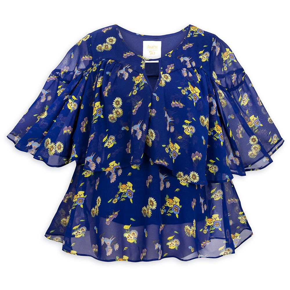 Celebrate the 70th Anniversary of Walt Disney’s Alice in Wonderland and the whimsical world of Disney Legend Mary Blair in this sheer woven top by Her Universe with chiffon capelet outer layer, keyhole neckline, and a fanciful floral print pattern inspired by pre-production art from the film.
