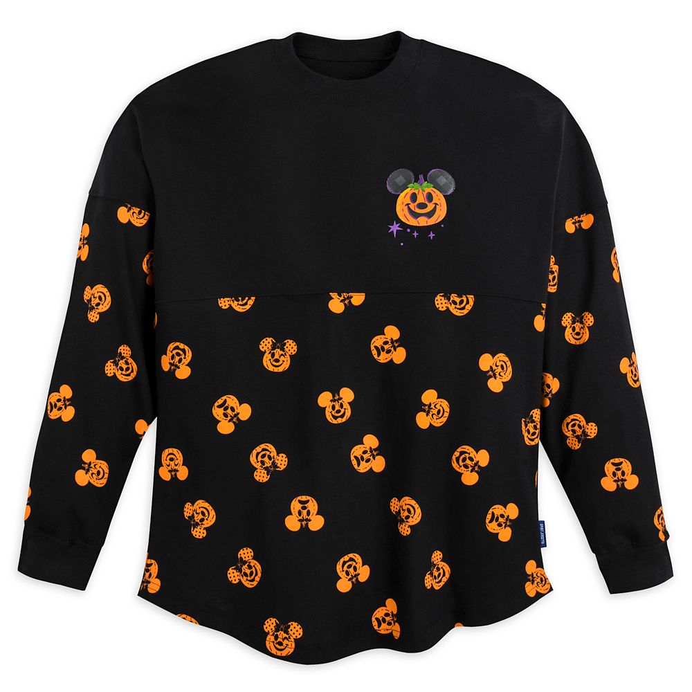 Summon the unrested souls of the spooky season in this premium pullover Spirit Jersey with pieced yoke, plus puffy ”Happy Halloween” banner–and an allover Mickey and Minnie Mouse Pumpkin print.
