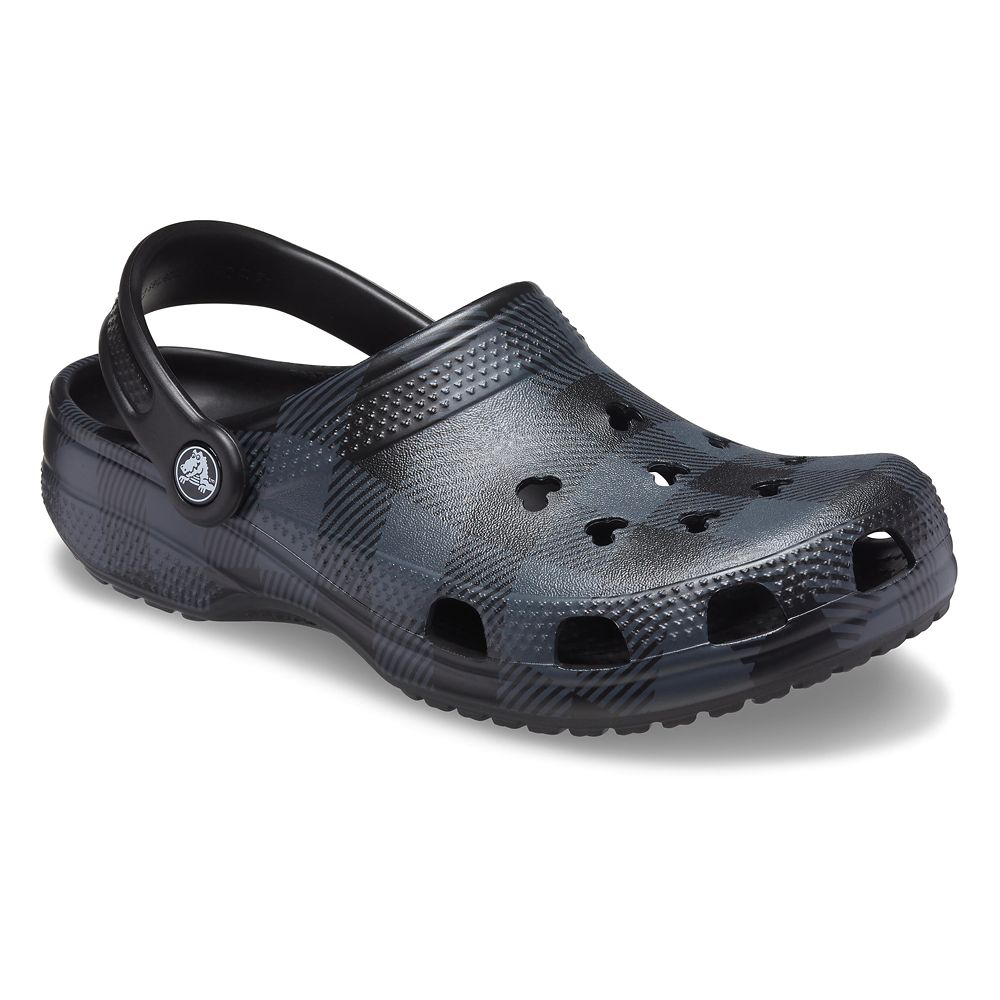 Stand out in the crowd when you rock these ultra comfy clogs for adults by Crocs. The slide-on shoes feature a subtle allover buffalo check design and Mickey icon-shaped ventilation holes for swell and stylish stepping.