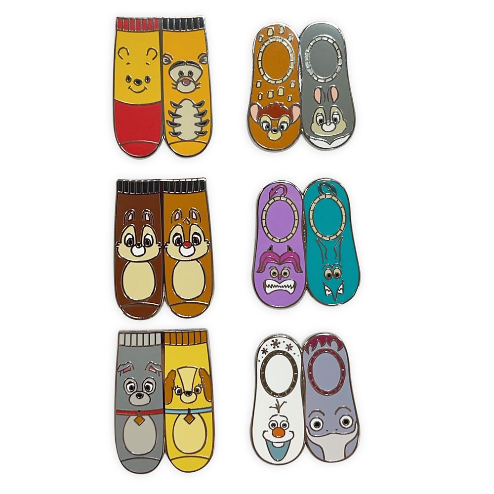 The Disney Magical Mystery Pin Collection Series 18 features a double dose of unexpected surprises. Each blind pack contains one randomly selected pin from a possibility of six different designs featuring a pair of classic Disney character favorites as socks or slippers.