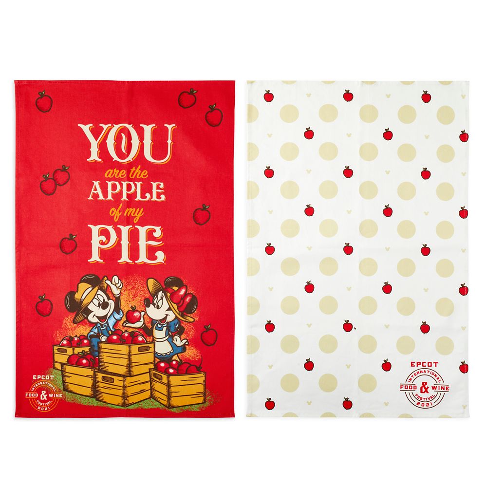 Washing up is always easier when you get help from Mickey and Minnie. The couple are pictured collecting apples on one of the kitchen towels in this souvenir set from the Epcot International Food & Wine Festival 2021.