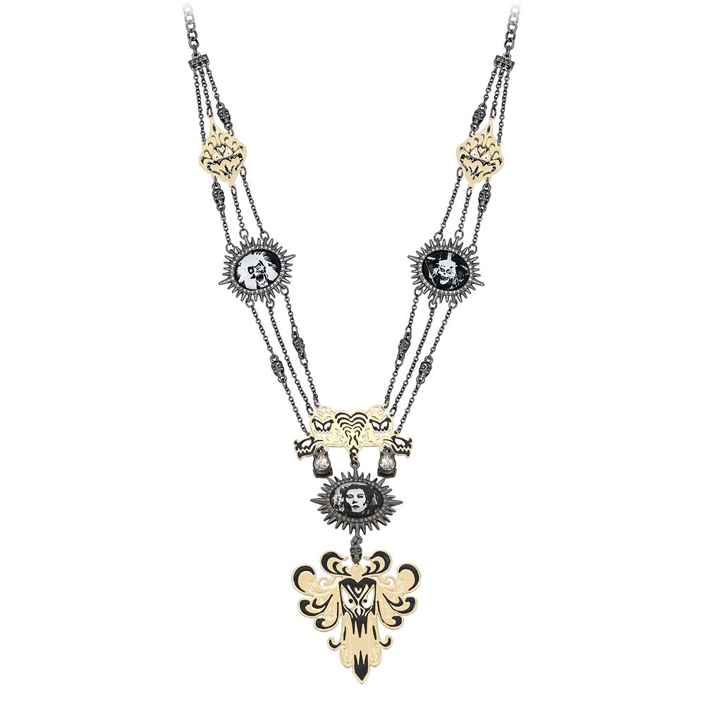 Inspired by The Haunted Mansion attraction, this ghoulish necklace is set in hematite-tone metal. Featuring delicate chains, tiny skull hardware, and ghostly cameos adorned with pavé set stones and edged with spikes, it’s a necklace to die for.
