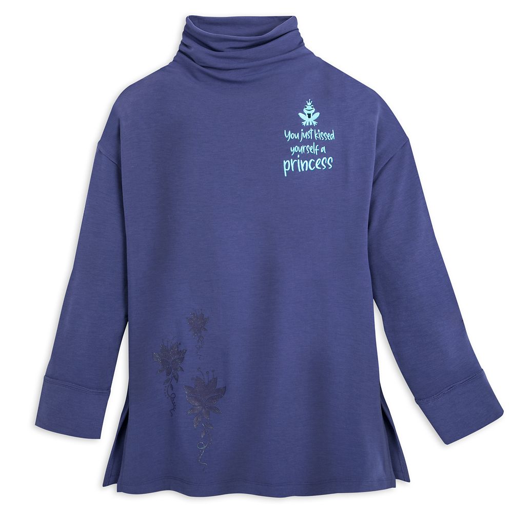 No need to dig a little deeper in your closet—this flowing, cowl neck top inspired by The Princess and the Frog will make your outfit a success! Embroidered with ”You just kissed yourself a princess” and frog in a crown on the chest, plus water lily screen art, this comfortable top has all the right ingredients.