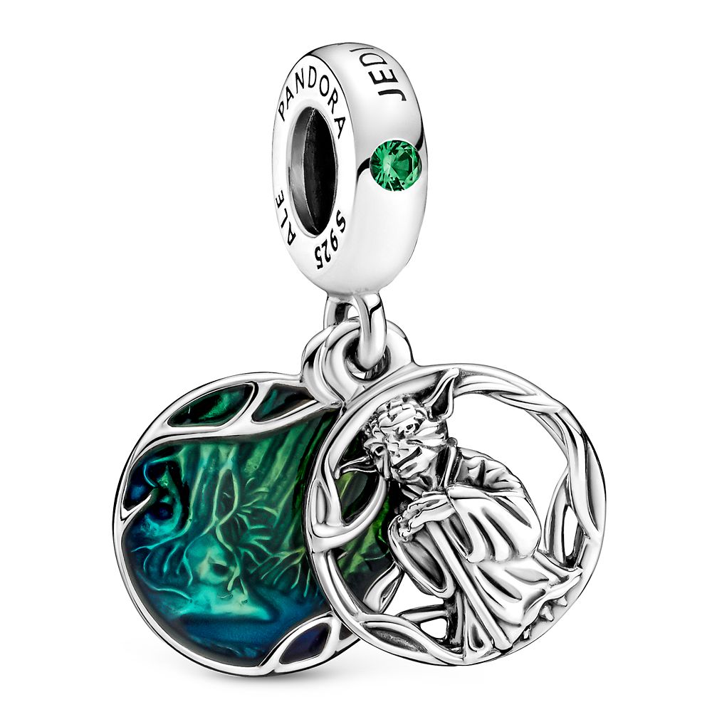 This gem studded silver bead by Pandora Jewelry features two dangling charms depicting Jedi Master Yoda and an enameled Dagobah landscape. Eye catching it is.