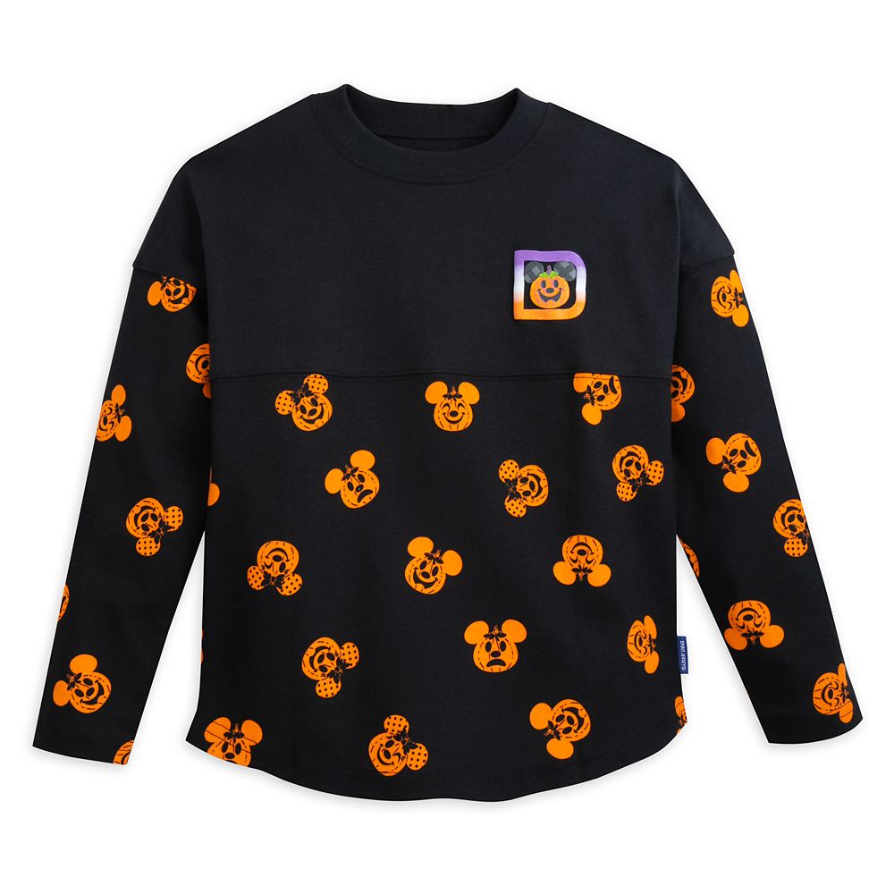 Channel the spirits of the spooky season in this premium pullover Spirit Jersey with pieced yoke, plus puffy Walt Disney World ”D” icon and logo in candy corn colors–and an allover Mickey and Minnie Mouse pumpkin print.