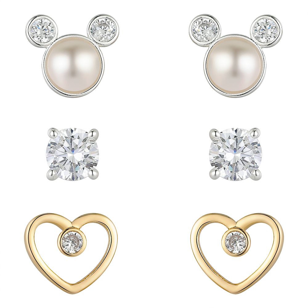 Mix and match Mickey style with this set of three different pairs of earrings. The three designs include a silver Mickey icon with pearlescent bead, a cubic zirconia stud, and an open heart stud with cubic zirconia accent.