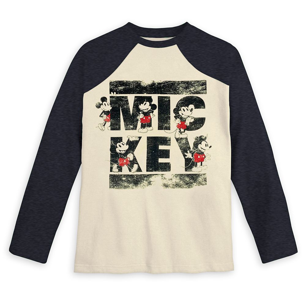 Mickey Mouse makes the all-American team with this vintage-look baseball tee sporting classic Mickey art and contrast long raglan sleeves.