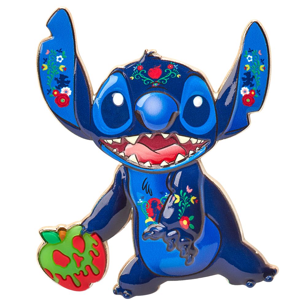 Inspired by the original Lilo & Stitch film trailers from 2002 featuring Stitch crashing classic Disney film scenes, this monthly, limited release series of collectible pins puts a new spin on the adored extraterrestrial. Each release honors a different, beloved Disney film. This month’s entry, inspired by Snow White and the Seven Dwarfs, features a glow-in-the-dark poisoned apple.