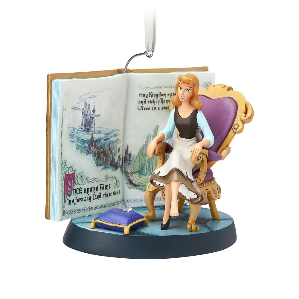 Make the holiday dream that you wish come true as our lovely Cinderella ornament recreates the fateful moment when the slipper fits. Providing a backdrop for the sculpted figure is a miniature reproduction of the storybook from the film’s opening sequence.” />