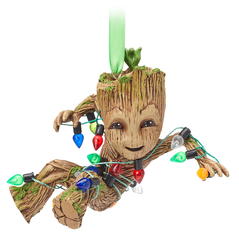 Baby Groot poses as a holiday tree tangled in a string of colorful party ”bulbs.” This sculpted Sketchbook Ornament will sprout fond memories of the season for light years to come.” />