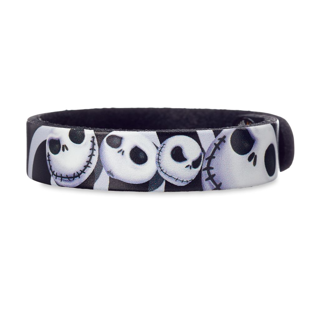 Be frightfully fashionable with this personalizable leather bracelet adorned in Jack Skellington art.” />
