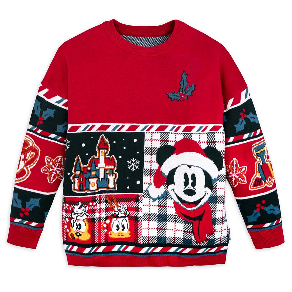 Inspired by the ”ugly sweater” tradition, this cozy knit kids’ pullover featuring Mickey and the gang is sure to be the hit of your holiday party. Plaid pattern midsection features festive icons and a ”Merry Christmas” message on the back.” />
