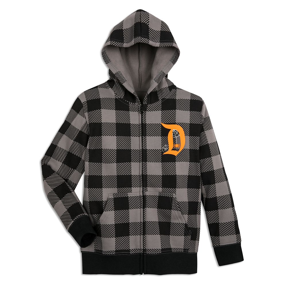 Still the chills this Halloween season in our plaid zip hoodie spotlighting a Mickey Mouse pumpkin design and ”D” icon , direct from Disneyland.” />