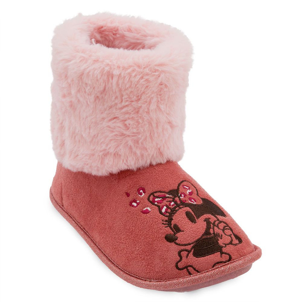 Head off to a most dreamy bedtime in these sweet slippers inspired by our leading lady, Minnie Mouse. Featuring Minnie on the toe, these plush boot-style slippers have fuzzy pink linings that keep your toes cozy.” />