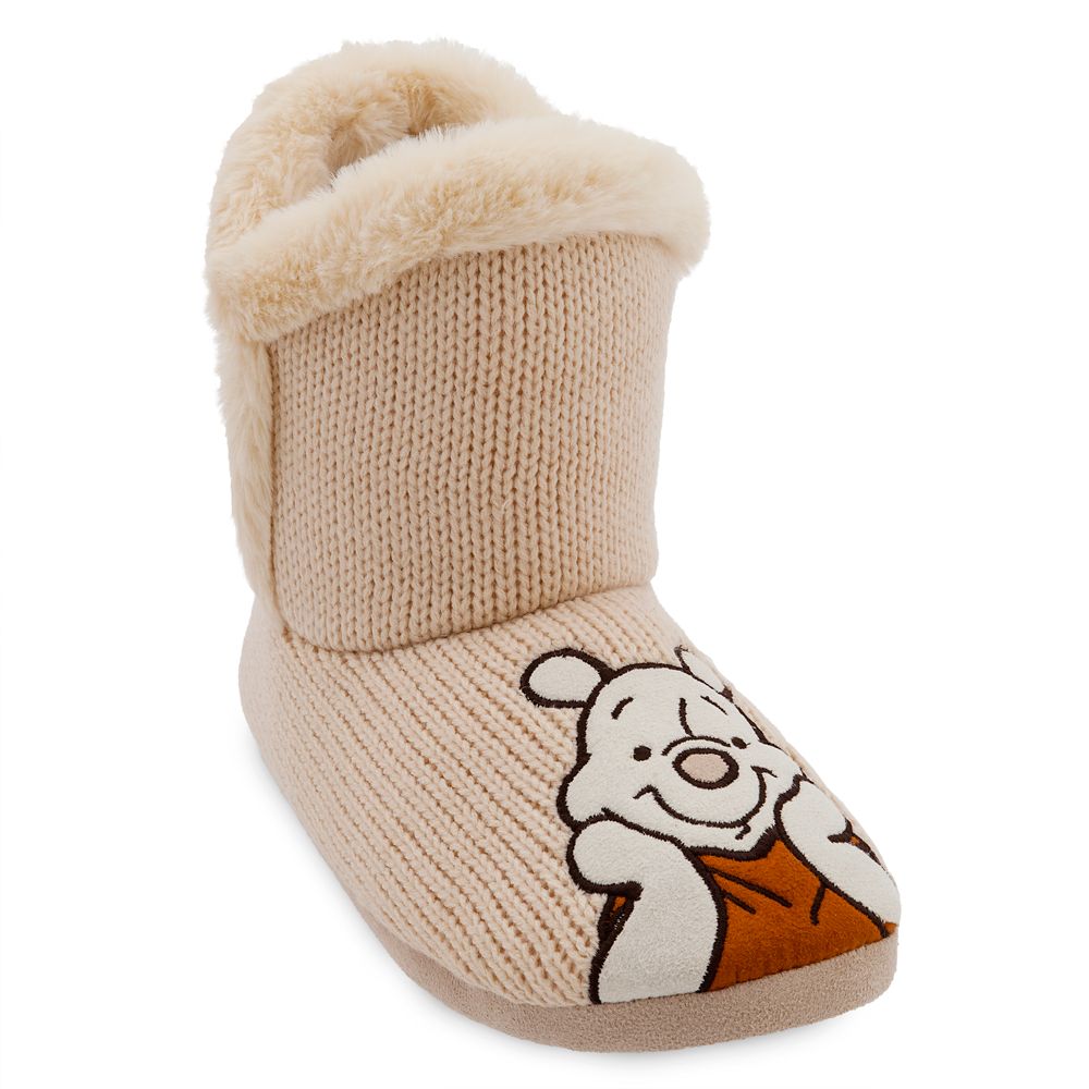 Cool nights call for cute and cozy slippers, and what could be cuter than Winnie the Pooh and Piglet looking up at you from the toes of these knit boot-style slippers with textured soles.” />
