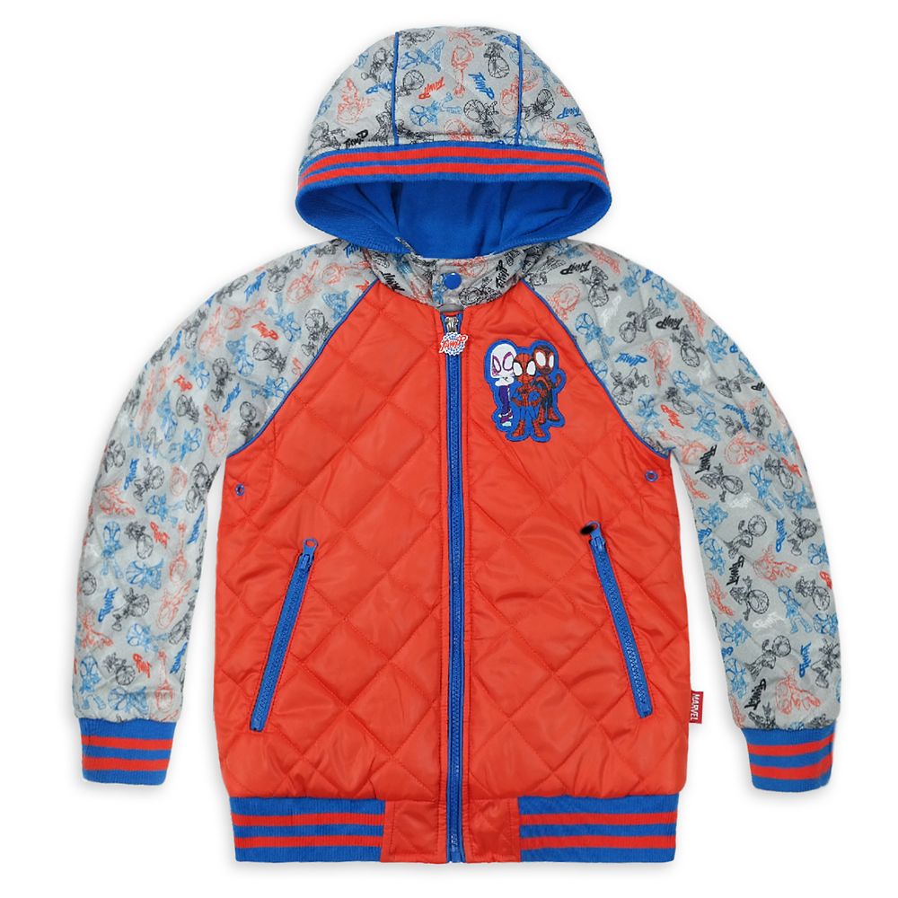 Spidey, Ghost-Spider, and Spin ”Team up” on this hooded jacket inspired by Spidey and His Amazing Friends on Disney Junior. The trio are featured at the front and back, while the raglan sleeves of this quilted jacket feature an allover print of the dynamic super young heroes.” />