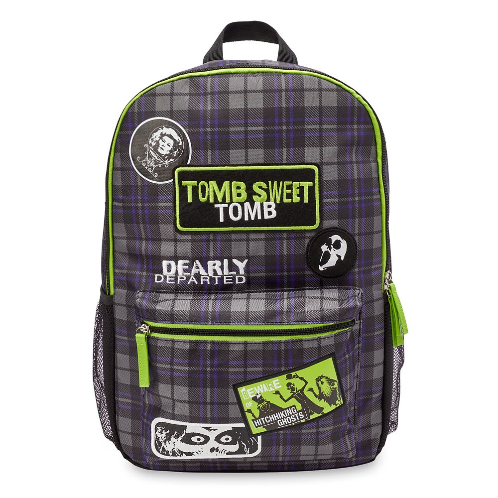 Show your frightfully fun fashion sense with this compact backpack inspired by The Haunted Mansion. The attraction’s signature colors make up the purple and gray plaid pattern that’s accented by an array of spooky appliqués. The main compartment and front pocket offer plenty of room for your eeriest essentials.” />