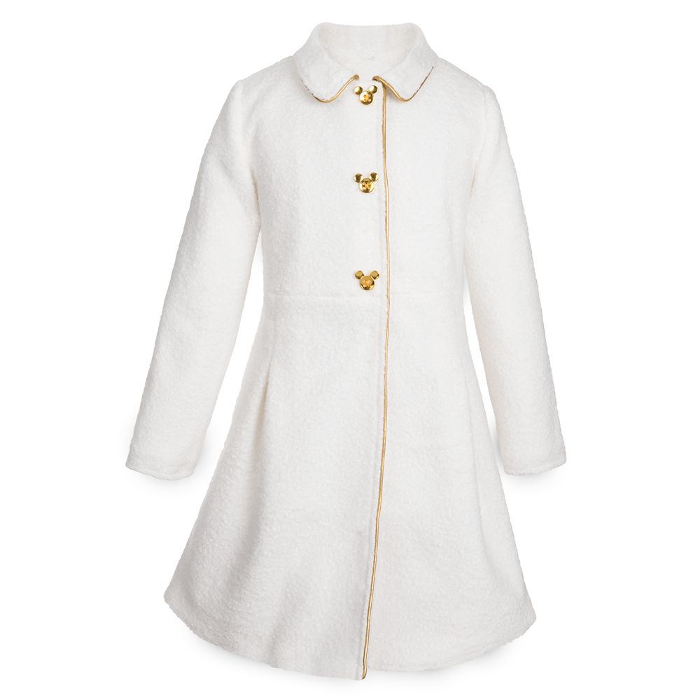 Your little one will be a winter fashion wonder in this chic, fitted holiday coat. The soft white exterior is accented with gold piping and decorative Mickey Mouse icon buttons, while the satin interior features gold snowflakes and Mickey icons.
