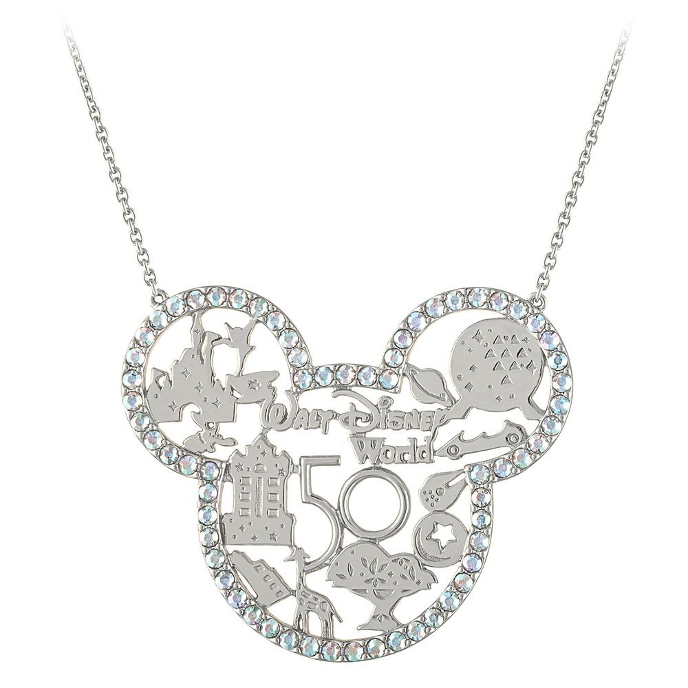 Join in The World’s Most Magical Celebration when wearing this commemorative Walt Disney World 50th Anniversary Necklace by Rebecca Hook. A sterling silver Mickey icon stationery pendant is outlined in Swarovski crystals and features die-cut icons representing the different Parks.