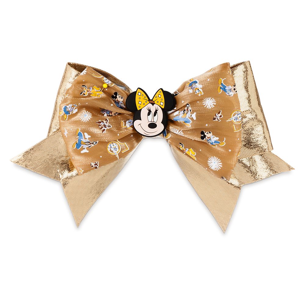 Light up your look for The Most Magical Celebration on Earth! A gold lamé bow is topped by an organza bow that features a Mickey and friends pattern, a PVC Minnie Mouse face, and LED lights.