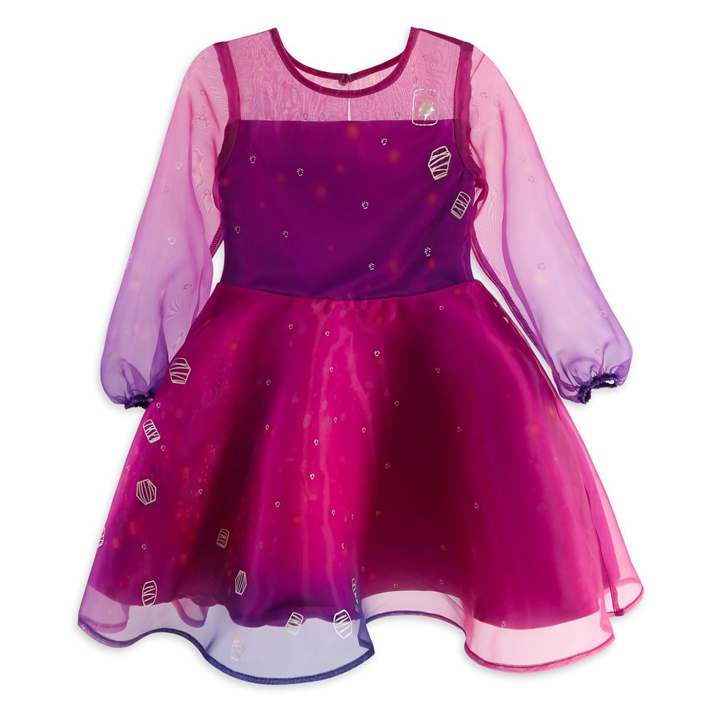 She’ll simply glow in this stunning frock inspired by Rapunzel. Fashioned in purple organza over satin, with metallic gold ink screen art, long bell sleeves, and a keyhole opening at back, this may be the best dress ever.