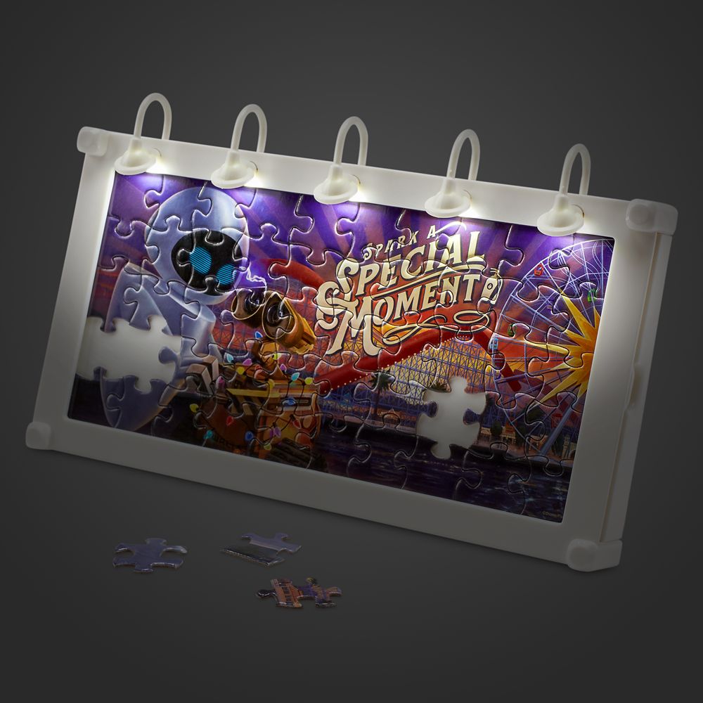 Spark special memories of Pixar Pier with our 50-piece WALL•E-themed mini puzzle. Designed after the billboards at Disney California Adventure, the the easel-back frame has overhanging lights that set off a sweet scene between the trash-compacting protagonist and E.V.E. as they stroll the boardwalk.
