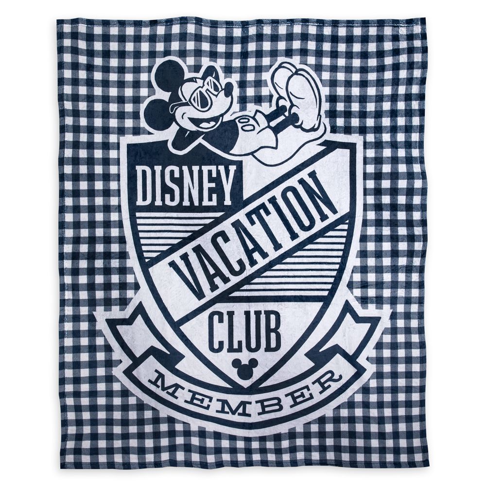 Enjoy the benefits of membership while snuggling under this cozy fleece throw featuring Mickey Mouse and the Disney Vacation Club Member coat-of-arms on a checked field.