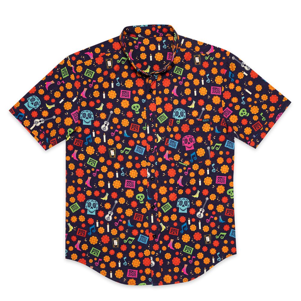 Inspired by the beautiful ofrenda inside Miguel’s home in Disney and Pixar’s Coco, this KUNUFLEX button down shirt features a pattern of bright marigolds, candles, calaveras, guitars, and music notes.
