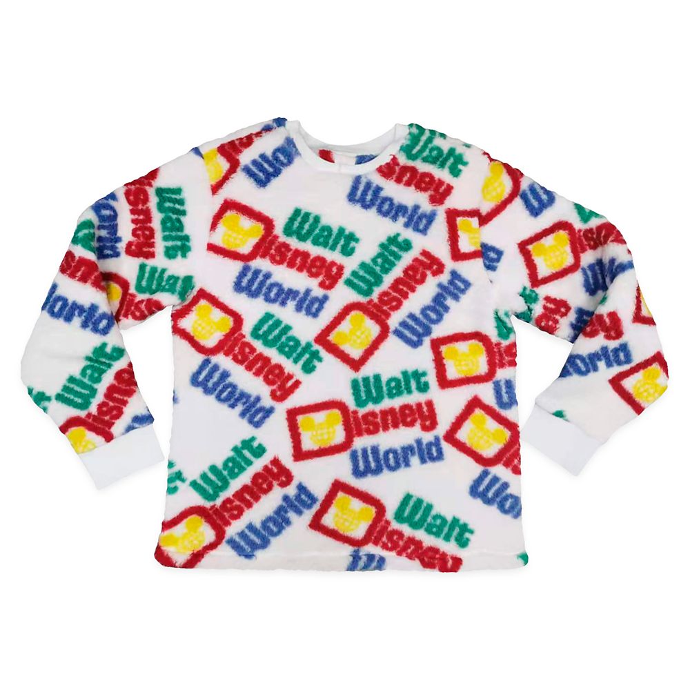 Escape the winter weather to The Most Magical Place on Earth in this long sleeve furry fleece pullover featuring allover Walt Disney World logo print pattern.