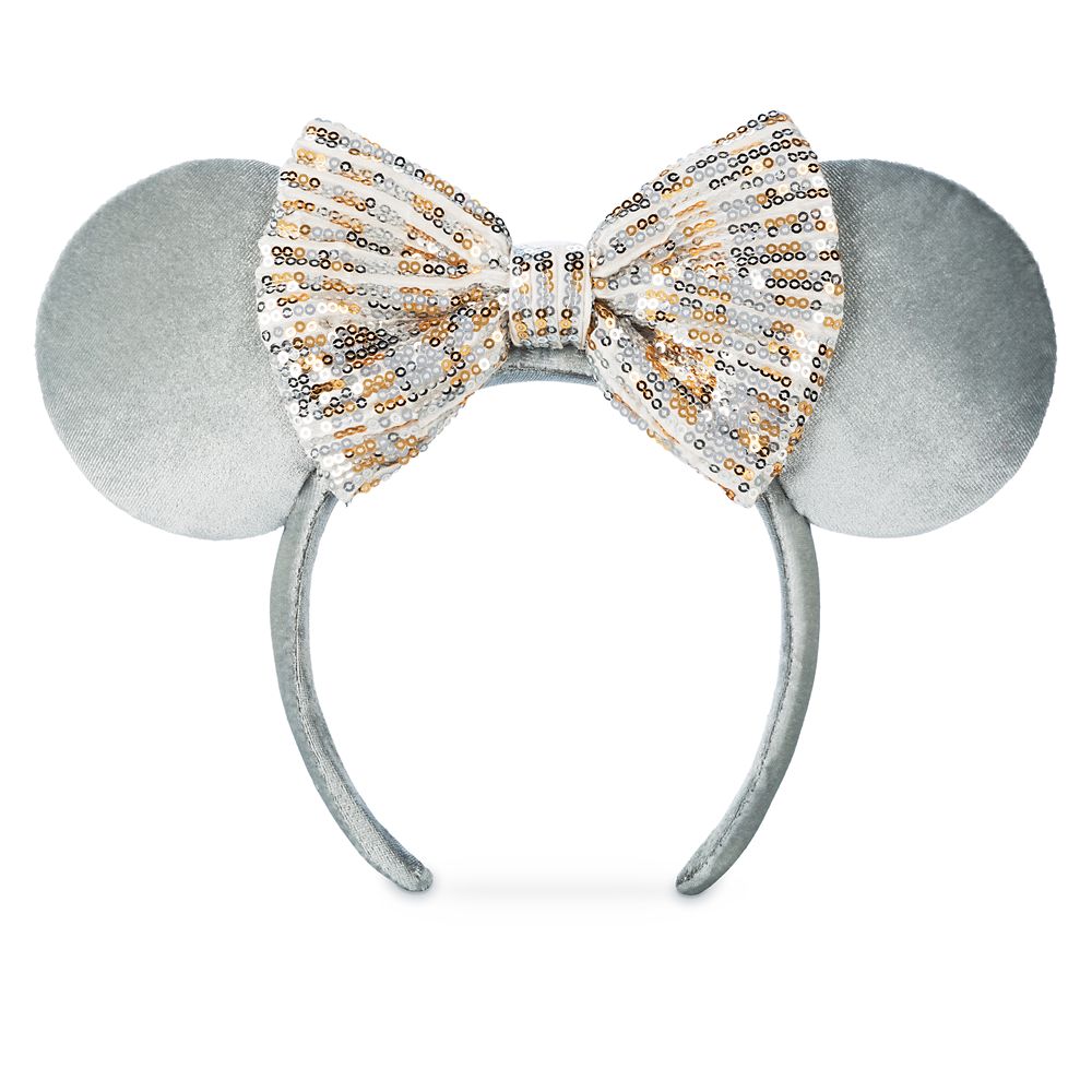 Keep a cool head with our Winter Frost Minnie Mouse Ear Headband, which features soft silvery-gray velour ears and a dazzling gold and silver sequin bow.