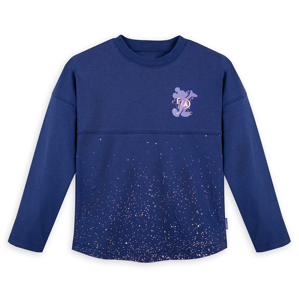 Join The World’s Most Magical Celebration in this 50th Anniversary Spirit Jersey with puffy, iridescent Walt Disney World logo across the back shoulder, plus 50 logo and Mickey Mouse silhouette on chest.