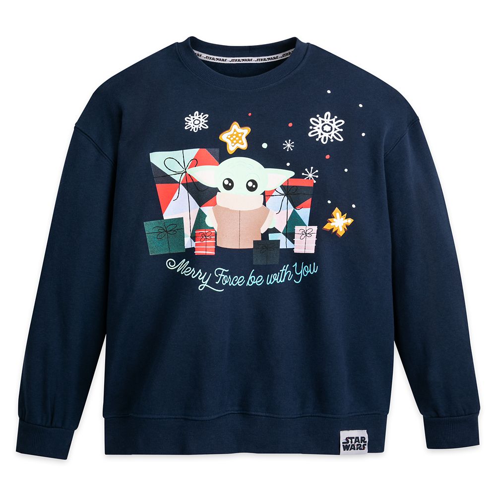 Grogu sends a holiday greeting to his legion of Star Wars fans: ”Merry the Force be with You” on this warm pullover sweatshirt with gingerbread scent.