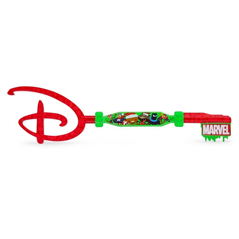 Mighty Marvel heroes Spider-Man, Captain America, Black Panther, Captain Marvel, Baby Groot, and Rocket Raccoon celebrate the holiday season in a cool cartoon style on this collectible key featuring Disney font ”D.”