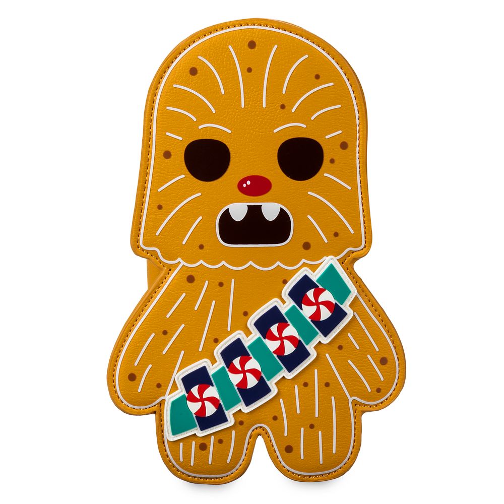 Chewie the red-nosed Wookiee had a very shiny nose. Han Solo’s co-pilot is reimagined here as gingerbread cookie with this festive crossbody bag by Loungefly. The faux leather design includes Chewie’s bandolier which continues the holiday theme with its peppermint swirl accents.