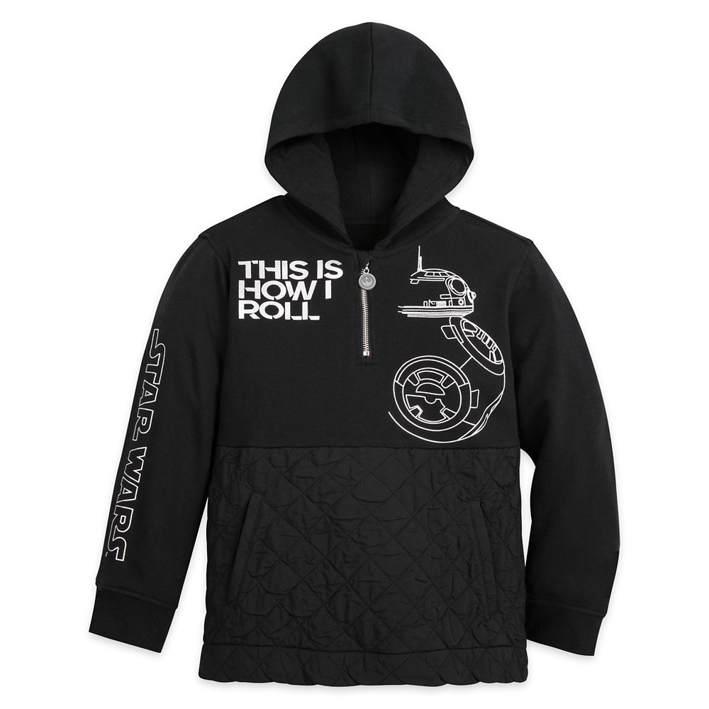 This is how you roll in a pullover 1/4-zip hoodie with metallic ink Star Wars logo on sleeve and BB-8 graphic on front, plus fashion trims. Have a ball!
