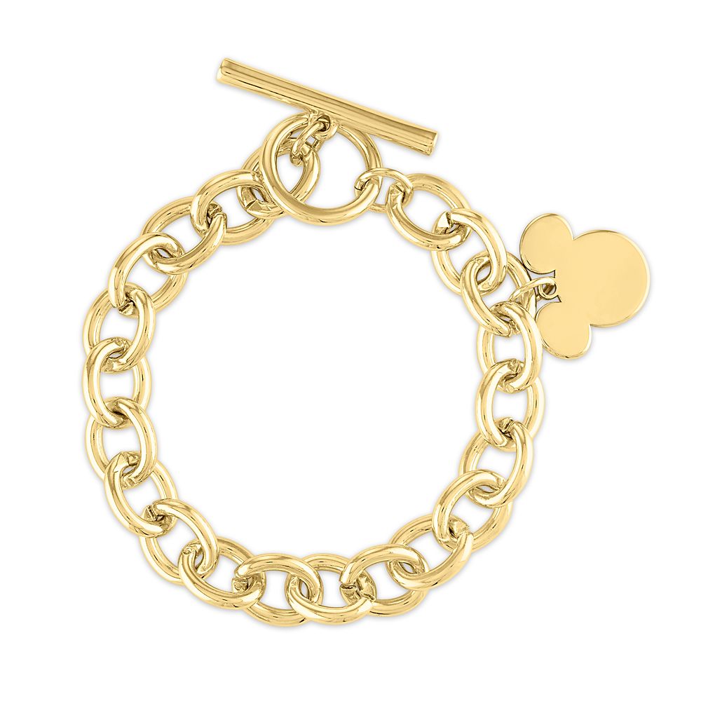 Mickey Mouse and chunky chain bracelets are both loved for their timeless sophistication. The two come together in this chic gold tone toggle bracelet that comes in a decorative gift box with satin ribbon handle. You’ll love it for ‘ears to come.
