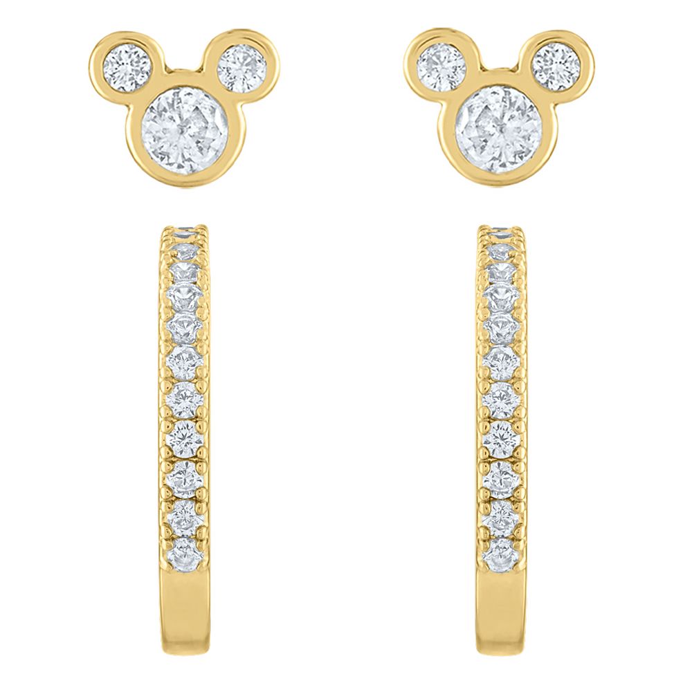 Mix up your Mickey Mouse style with this set of two pairs of goldtone earrings. The dazzling Mickey icon studs are set with flawless cubic zirconia, as are the post-back half hoops.