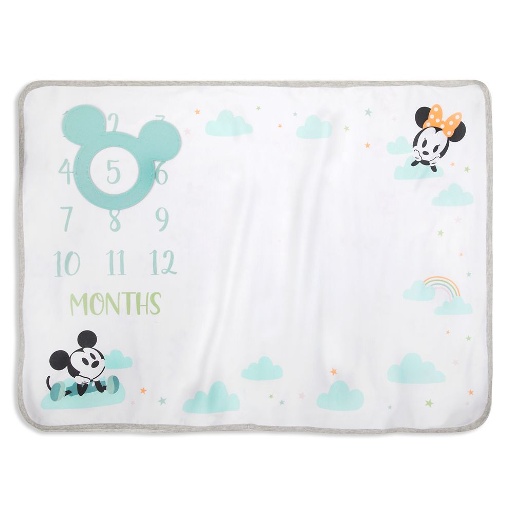 Mark every month of baby’s first year with Mickey and Minnie on this soft milestone blanket. Use the felt Mickey icon marker to circle the right number as baby relaxes on the blanket for an oh-so-sweet photo moment.