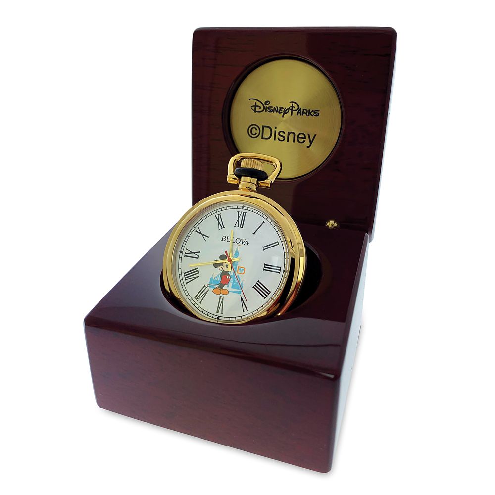 This Bulova polished goldtone pocket watch with removable chain from the Walt Disney World 50th Anniversary Vault Collection highlights Mickey Mouse and Cinderella Castle on the face. Encased in a solid hardwood presentation box, with a high-gloss finish over mahogany stain, it will serve as a timeless keepsake.