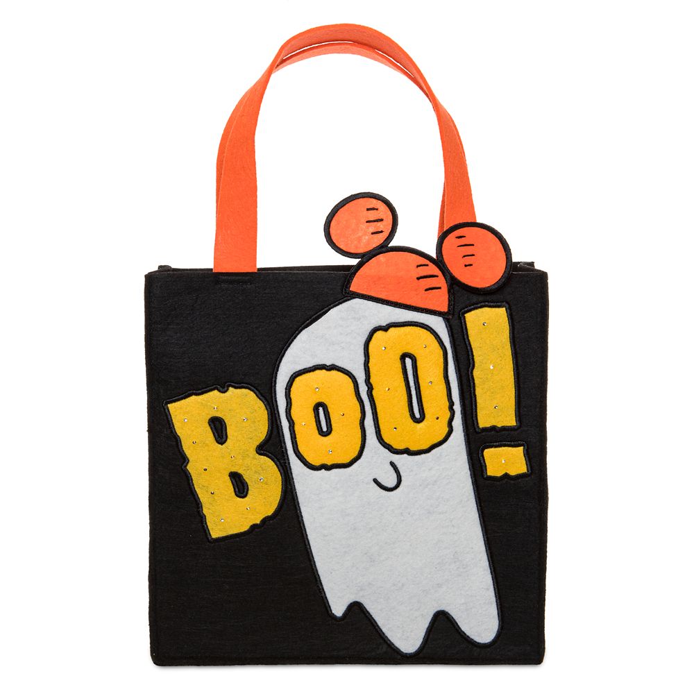 - The other side features a ghost with a 3D orange Mickey Mouse ear hat peeking over the bag and ”Boo!” text